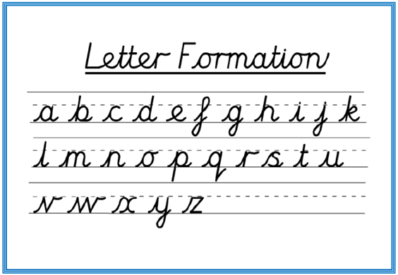 After many 'free flow' exploratory experiences, where children can rehearse writing in their own way, they are introduced to cursive letter formation whereby the letters are written the same but we start to write them on the line and we encourage a 'flick' at the end. Teachers expose children to cursive writing right at the start when they create displays, instruction sheets and when they write on dry-wipe/interactive boards, for example; this continues all the way through school. We also use a special font when creating worksheets for all children across the school and one which they can use themselves.