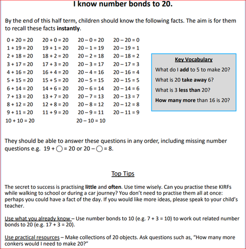 To help develop children's fluency in mathematics, we ask them to learn Key Instant Recall Facts each half term. Children should aim to practise their KIRFs at least three times a week.