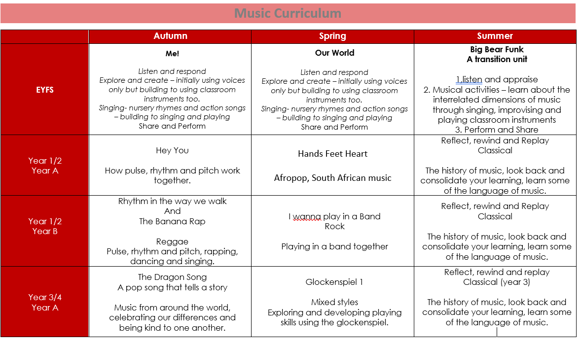 Our children become confident performers and their joy is evident when they sing and play. Attendance at evening events is always excellent and many of our children further their music lessons when they move on to their secondary phase. Few children suffer feelings of anxiety and stress and are able to regulate their emotions and focus well in lessons. Assessment in music is ongoing and informs teachers about future planning, lesson activities and differentiation. Summative assessment informs staff of the improvements or skills that still need to be embedded. Music is monitored throughout all year groups using lesson observations and pupil interviews.