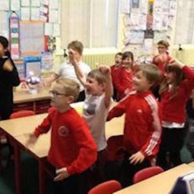 Oak Class using their bodies to find the pitch and rhythm of a piece of music.